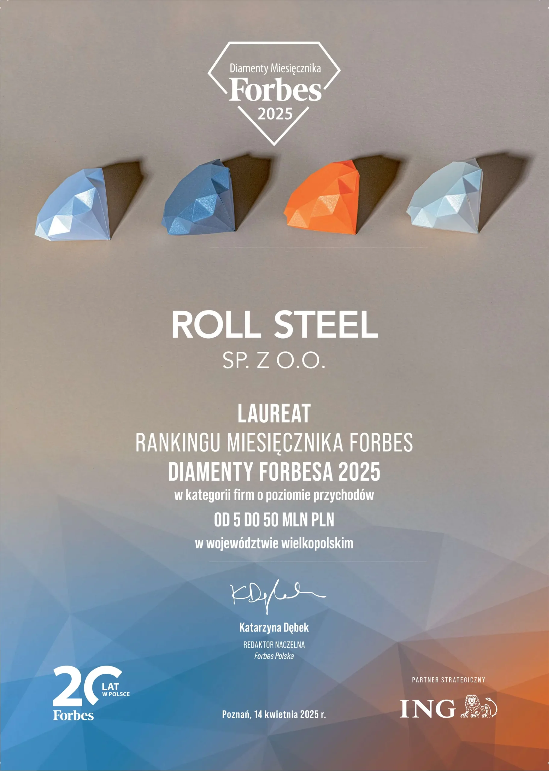 Na podstawie danych finansowych z Krajowego Rejestru Sądowego firma ROLL STEEL Sp.z o.o została wyróżniona tytułami: